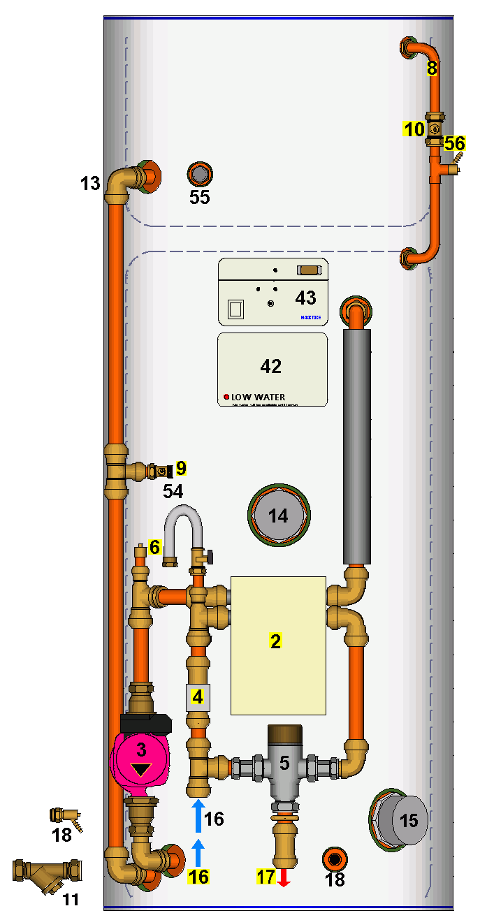 1 Integral Feed & Expansion Tank 2 Plate Heat Exchanger 3 Heat Exchanger Pump 4 Flow Switch 5 Thermostatic Blending Valve, Mixcall III 7 Automatic Air Vent 8 Filling Vent 9 Feed to Ball Valve 10 Isolating Valve 11 Y-Pattern Strainer (supplied loose) 12 Overflow (supplied loose) 13 Cold Feed / Expansion 14 Immersion Heater 3kW Incaloy with Stat 16 Cold Mains In, 22mm 17 Hot Mains Out, 22mm 18 Drain Cock 19 Flow From Boiler 28mm 21 Flow to Primary Coil 22 Return from Primary Coil 23 Flow to Heating 28mm 25 By-Pass Connection 15mm 26 Primary Pump UPS 15/60 29 Primary Coil Balancing Valve 30 Primary Expansion Vessel,