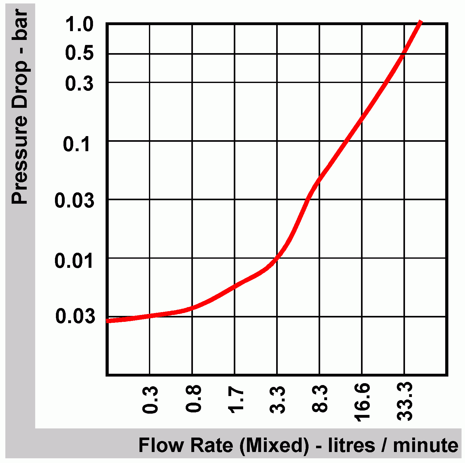 The Valve is adjustable from 27°C to 67°C, and has a lockable head, as shown. Typically the valve should be set to obtain a supply temperature of 65°C, to protect against Legionella. Check the setting of the Thermostatic Blending Valve by opening a hot water outlet to a low flow rate (approximately 10 litres per minute) and measuring the output temperature. The head of the Blending Valve may be locked in position if required.The graph shows the pressure drop across the valve for various hot water flow rates. |